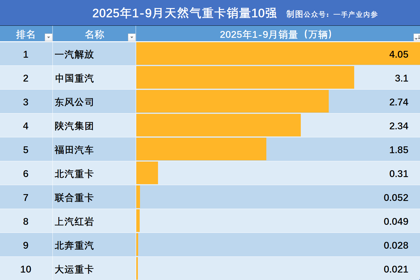 另附:2025年1-9月中国燃气重卡销量10强厂商名单,数据源于:交强险统计