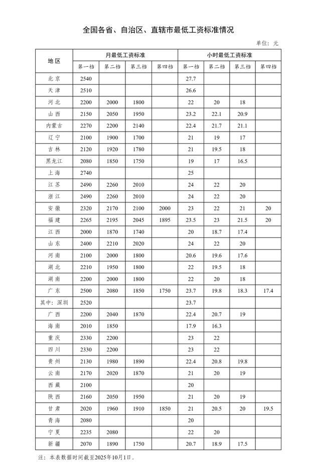 近日,人力资源和社会保障部官网发布最新《全国各省、自治区、直辖市最低工资标准情况》。