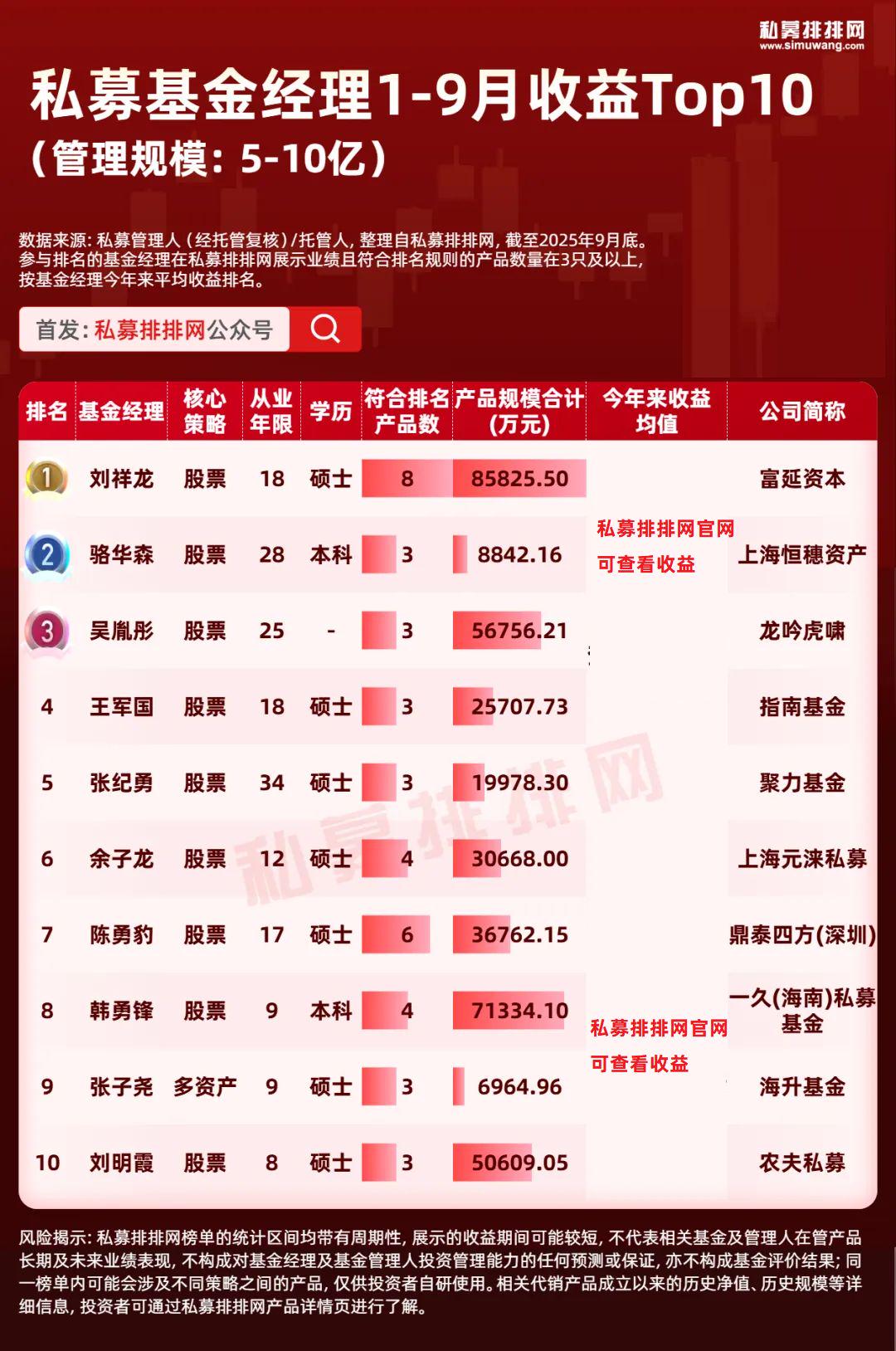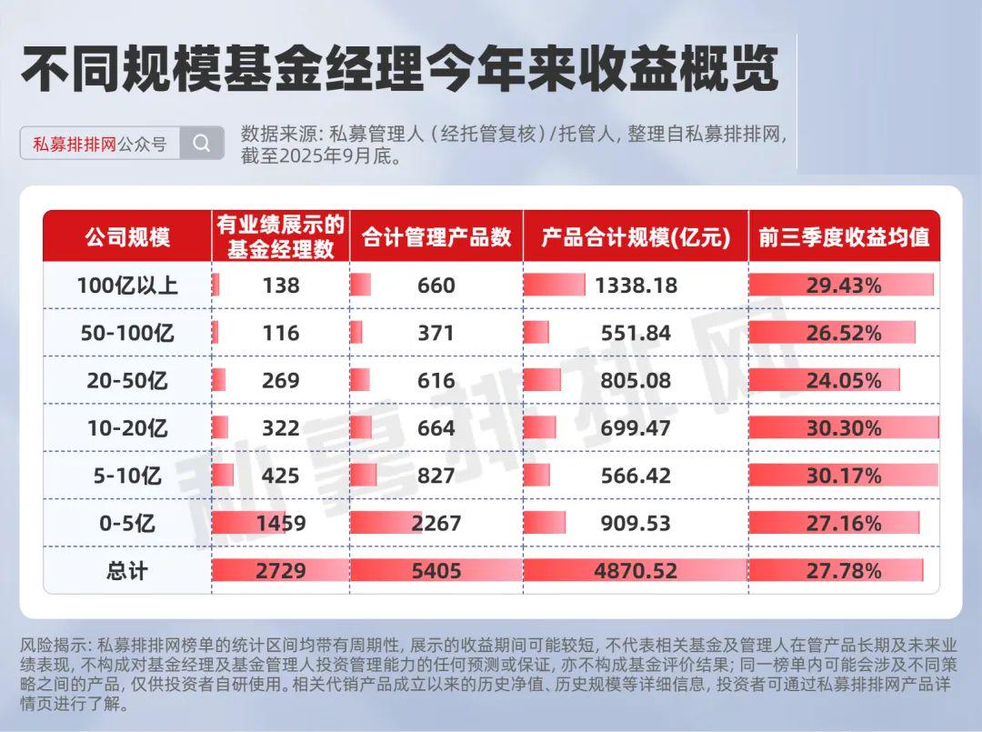 截至2025年9月底,来自50-100亿私募且“在私募排排网有3只及以上的私募产品有业绩展示”的基金经理共有48位。
