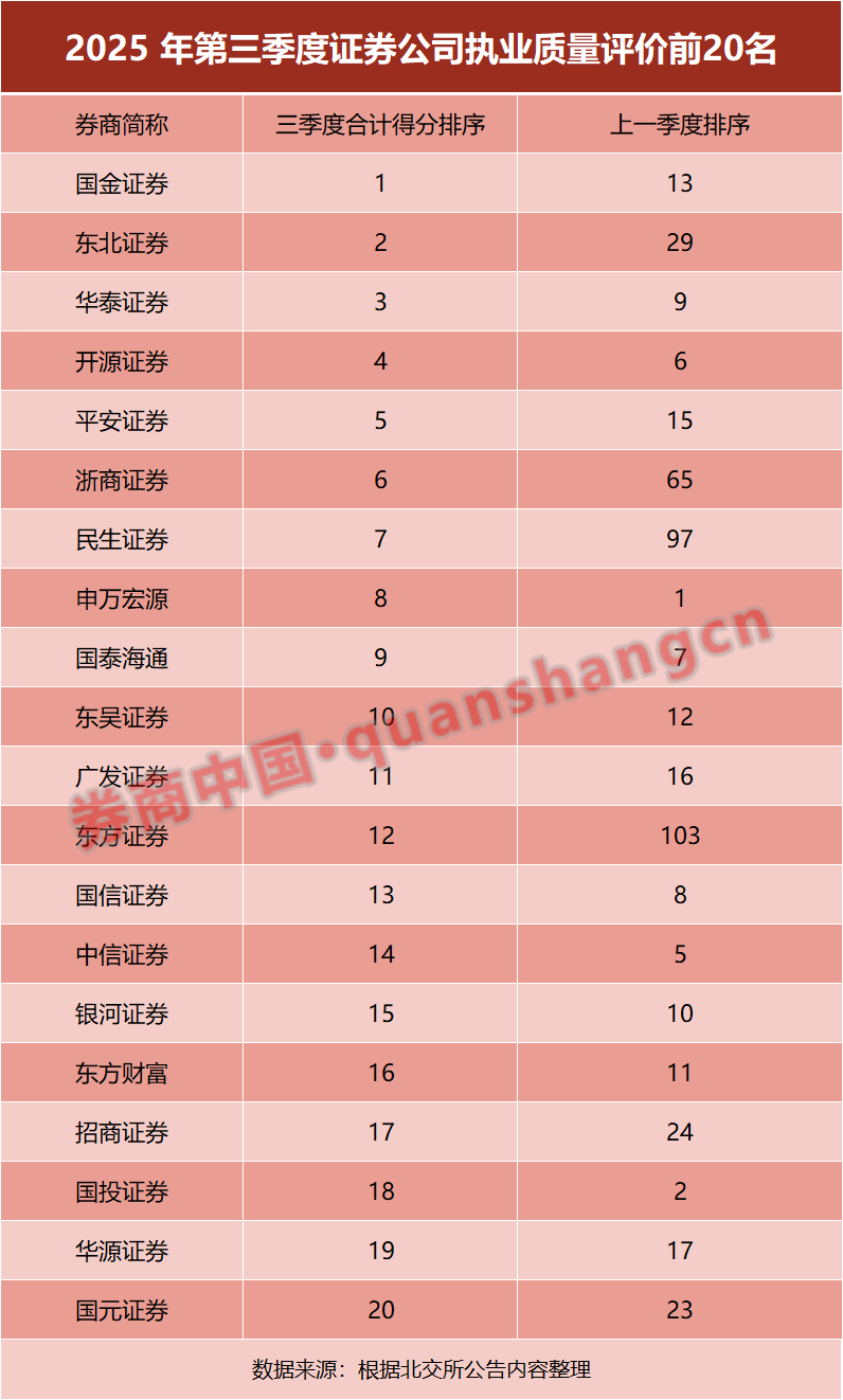 10月24日,北京证券交易所、全国股转公司发布了2025年第三季度证券公司执业质量评价结果。相比上一季度,榜单前十重新洗牌,榜首由申万宏源易主为国金证券;得益于投行业务,东北证券、浙商证券、民生证券排名大幅跃升,成功跻身前十。