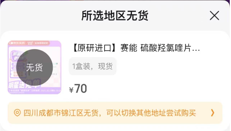 此外,红星资本局在淘宝、京东等电商平台看到,单盒赛能的价格在70元至110元不等,但并非所有地区都能买到。以京东平台大药房为例,红星资本局切换了重庆、成都、上海等多个地址,均显示“所选地区无货”。