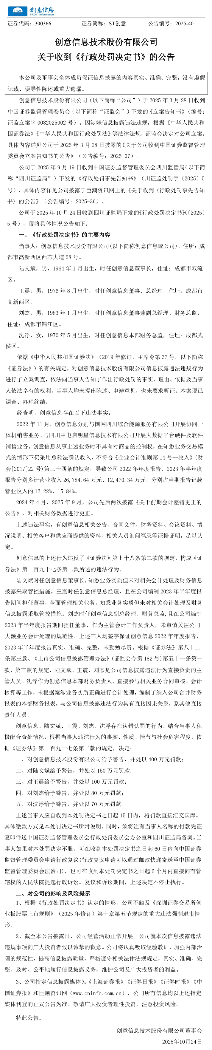 2025年10月24日晚,ST创意(创意信息,300366.SZ)公告,公司收到四川证监局下发的《行政处罚决定书》。此前的2025年3月28日,公司公告,因涉嫌信息披露违法违规,中国证监会决定对其立案。