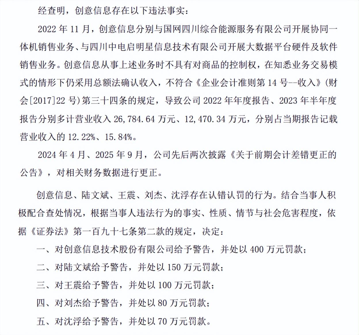 对此,四川证监局对创意信息给予警告,并处以400万元罚款。