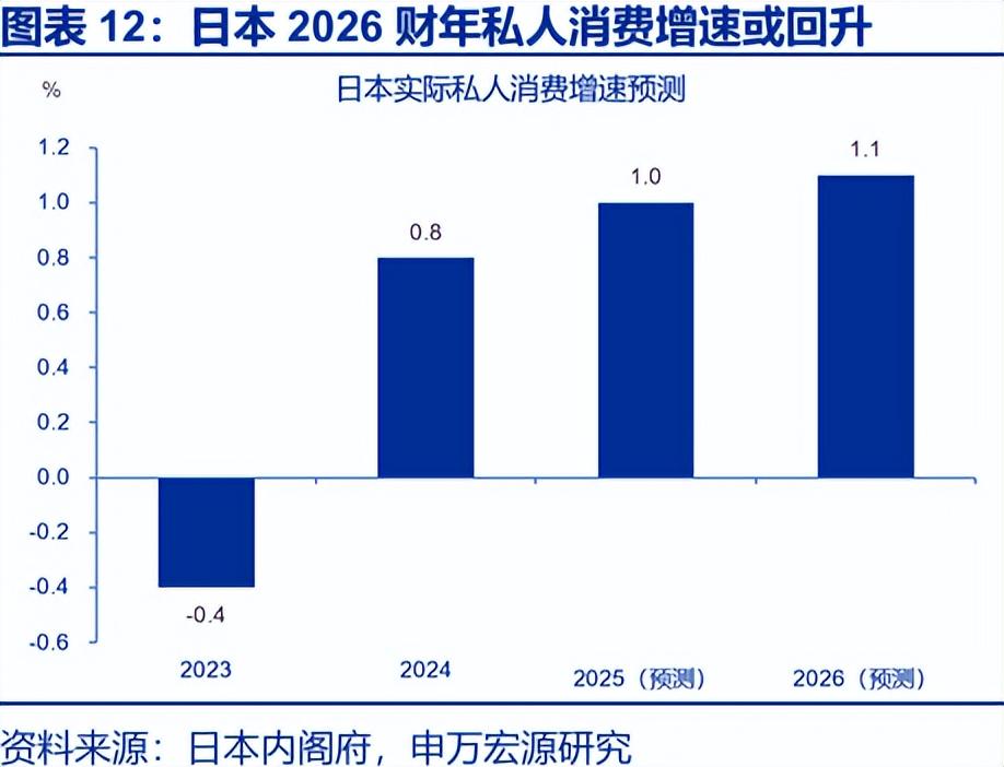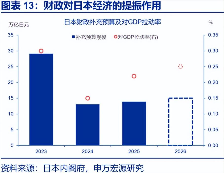 日本明年实际经济增速或小幅提升至0.9%,财政刺激对经济的拉动率小幅上升。参考日本内阁府预测,2025日本实际GDP增速0.7%,2026升至0.9%,增长的主要贡献来自内需,日本私人消费温和升至1.1%;净出口在2025年因关税冲击拖累经济增长,2026年出口增速或加快至2.2%,对GDP的贡献恢复至0%。财政对明年日本经济的作用小幅提升,高市早苗推进的补充预算可能超过去年的13.9万亿日元,对GDP的拉动效果或在0.25%左右,小幅高于去年。