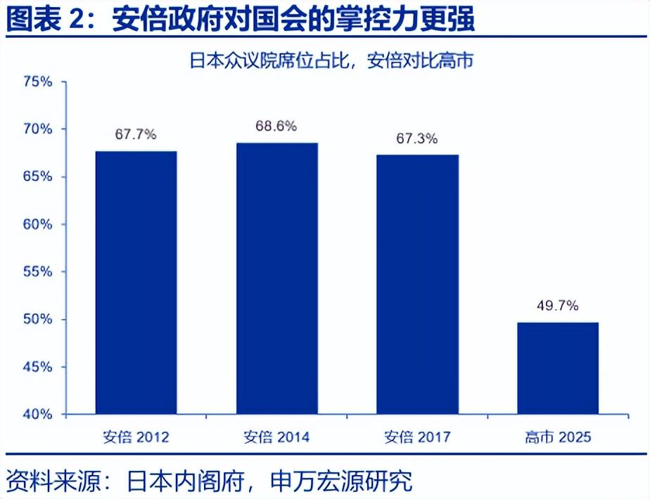 高市早苗存在政治约束,政策推行能力可能低于安倍。一方面,执政党在国会的优势走弱,法案通过难度更大。安倍2013年后形成两院的稳定多数局面,结束了“扭曲国会”,在众议院长期占比达2/3,即便参议院反对,普通法案也能凭众议院三分之二强行通过,这是安倍推动多轮预算外刺激(2013年、2019年)、安保法制(2025)通过的硬性保障。但在2025年,自民党在众议院为196席,与维新会联合执政后,总数231席,距离过半仍差2席,参议院也无多数优势,高市早苗的普通立法通过难度大于安倍时期。