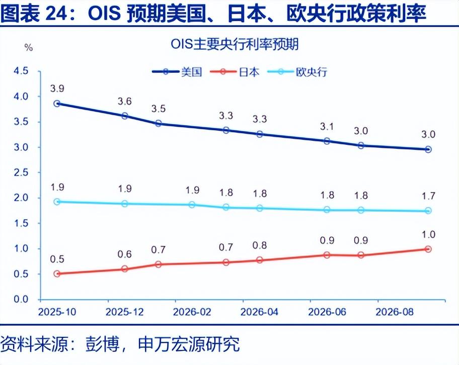市场预期日央行2026年将降息两次、累计50bp,节奏依赖于日元、通胀、日债利率和政治环境。参考OIS市场预期,10月及12月日央行或按兵不动,2026年或有两次加息,3月加息25bp至0.75%,9月或再加息25bp至1%附近。参考IMF预测,终点利率或在1.5%附近。