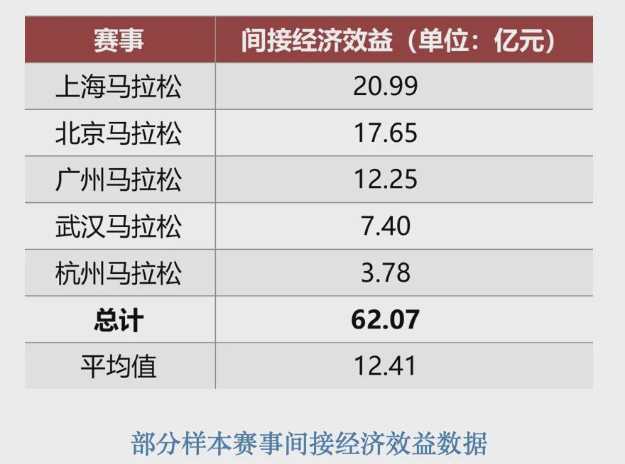 而据中国田径协会不完全统计,截至2024年12月20日,全国举办的10项国际金标及以上马拉松赛事,直接经济效益总计为54.30亿元,间接经济效益中,赛事产出效应(对GDP的贡献)125.39亿元,赛事就业效应(因赛事而新增就业岗位数)5.58万个。