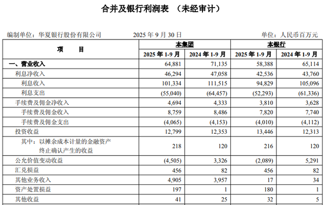 华夏银行对前三季度业绩进行说明,营业收入、净利润同比下降主要来自两方面原因:一是受债券市场波动影响,公允价值变动收益减少;二是受行业息差趋势性收窄影响,利息净收入同比减少。上述波动与市场环境变动、行业整体趋势基本一致。
