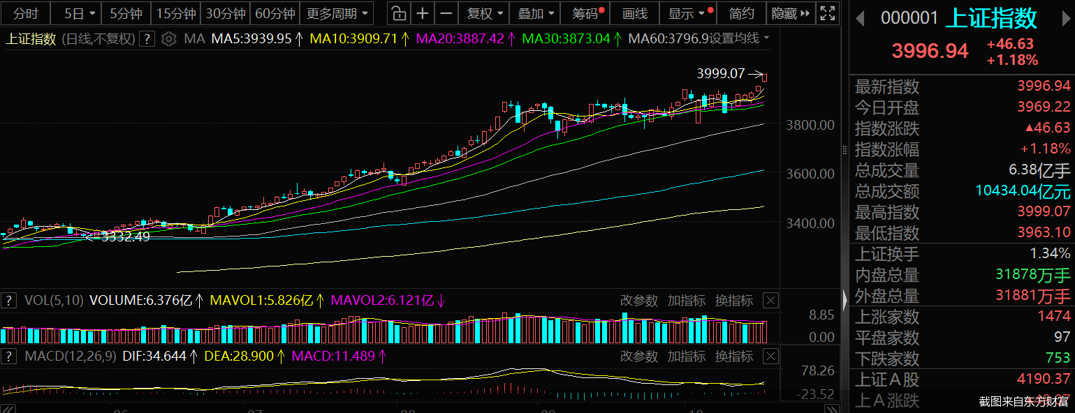 最高触及3999.07点,上证综指10月27日距离4000点仅一步之遥。