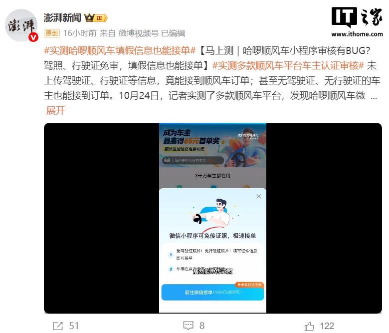 IT之家 10 月 28 日消息,据澎湃新闻 10 月 27 日报道,哈啰顺风车微信小程序存在漏洞:未上传驾驶证、行驶证等信息,竟能接到顺风车订单;甚至无驾驶证、无行驶证的车主也能接到订单。