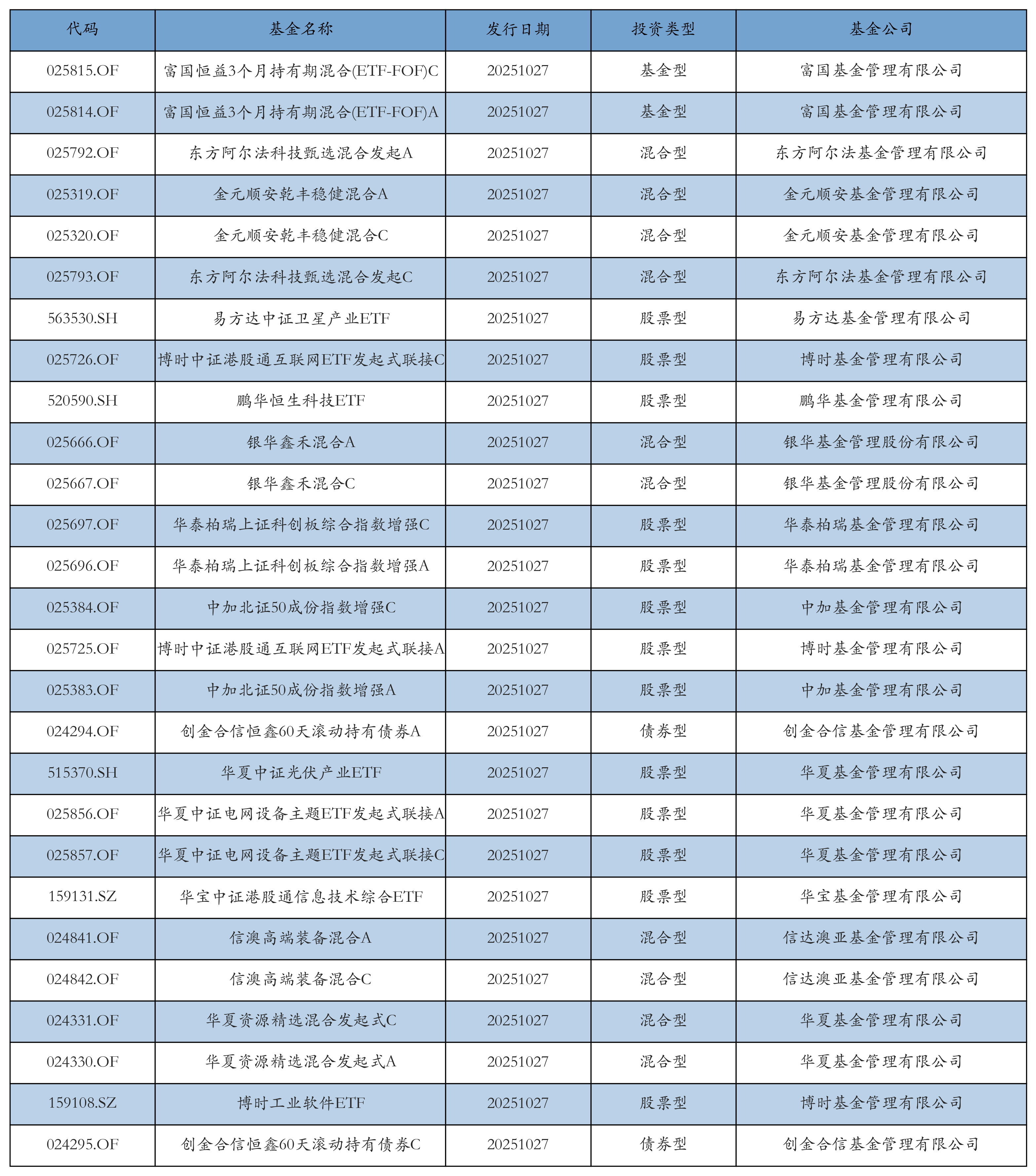 昨日有27只新基金发行,分别为:富国恒益3个月持有期混合(ETF-FOF)C、富国恒益3个月持有期混合(ETF-FOF)A、东方阿尔法科技甄选混合发起A、金元顺安乾丰稳健混合A、金元顺安乾丰稳健混合C、东方阿尔法科技甄选混合发起C、易方达中证卫星产业ETF、博时中证港股通互联网ETF发起式联接C、鹏华恒生科技ETF、银华鑫禾混合A、银华鑫禾混合C、华泰柏瑞上证科创板综合指数增强C、华泰柏瑞上证科创板综合指数增强A、中加北证50成份指数增强C、博时中证港股通互联网ETF发起式联接A、中加北证50成份指数增强A、创金合信恒鑫60天滚动持有债券A、华夏中证光伏产业ETF、华夏中证电网设备主题ETF发起式联接A、华夏中证电网设备主题ETF发起式联接C、华宝中证港股通信息技术综合ETF、信澳高端装备混合A、信澳高端装备混合C、华夏资源精选混合发起式C、华夏资源精选混合发起式A、博时工业软件ETF、创金合信恒鑫60天滚动持有债券C,详情见下表:
