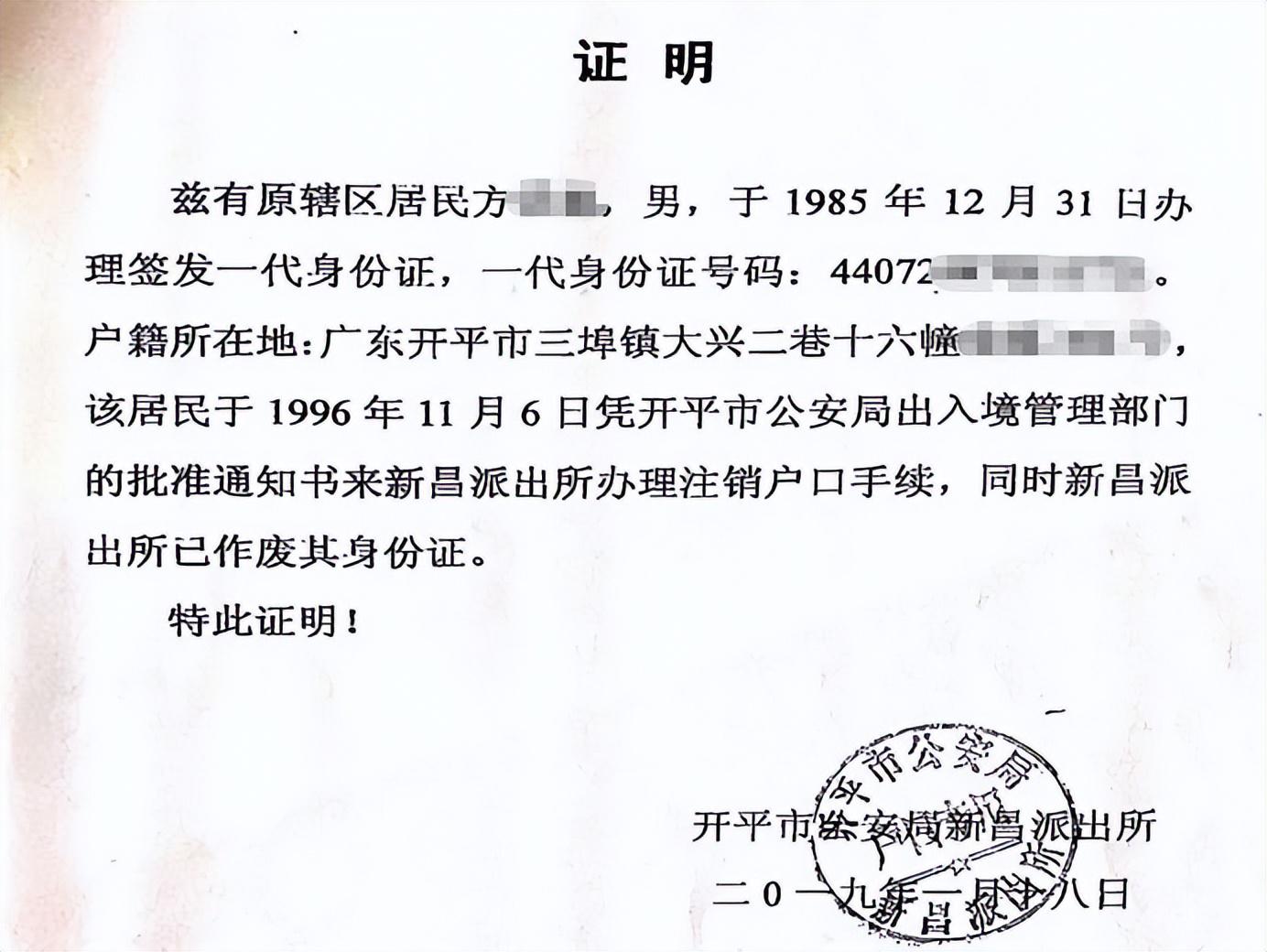 方某某原户籍为广东开平,1996年11月已办理了注销户口手续,原国内身份证已作废。