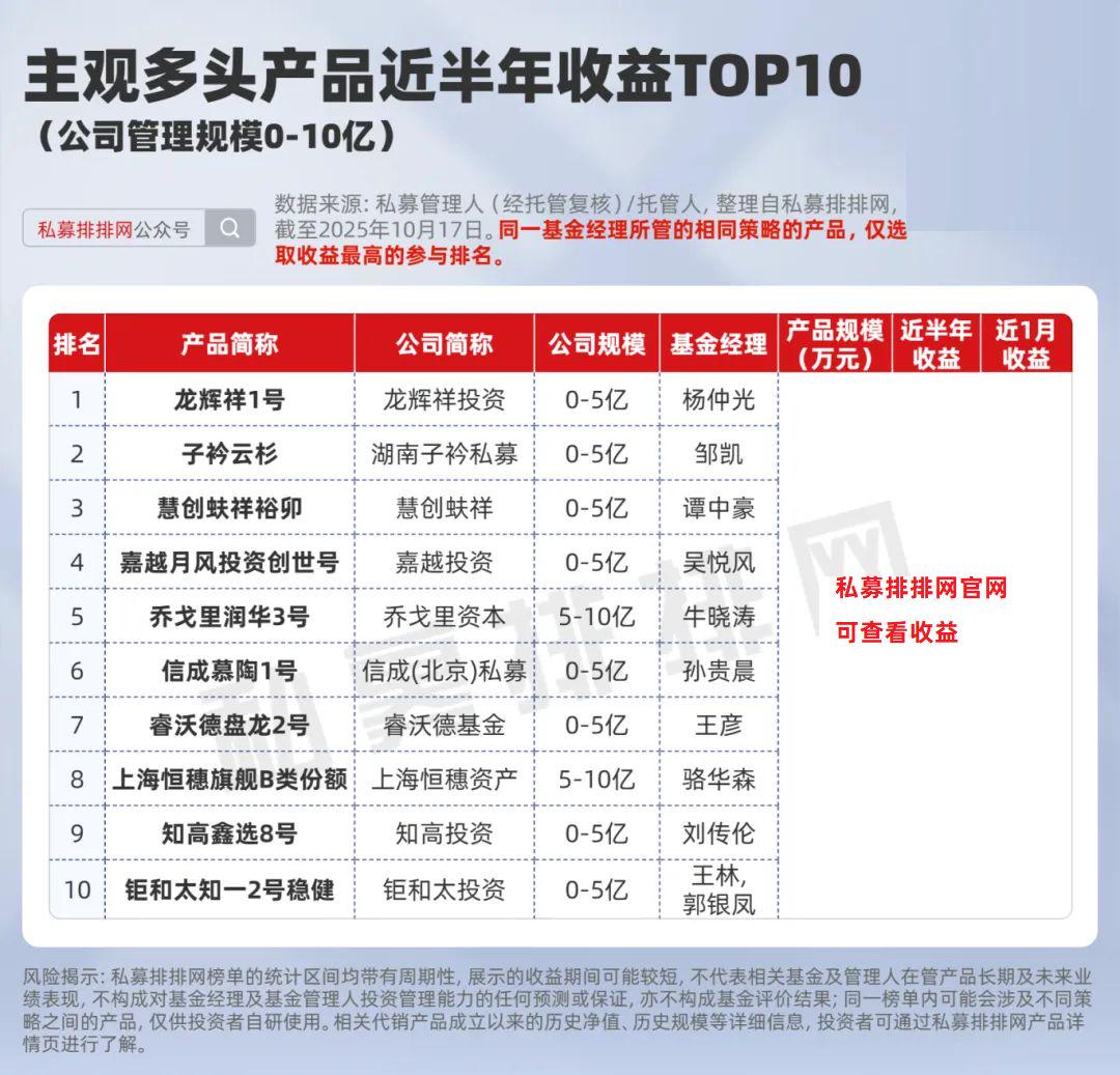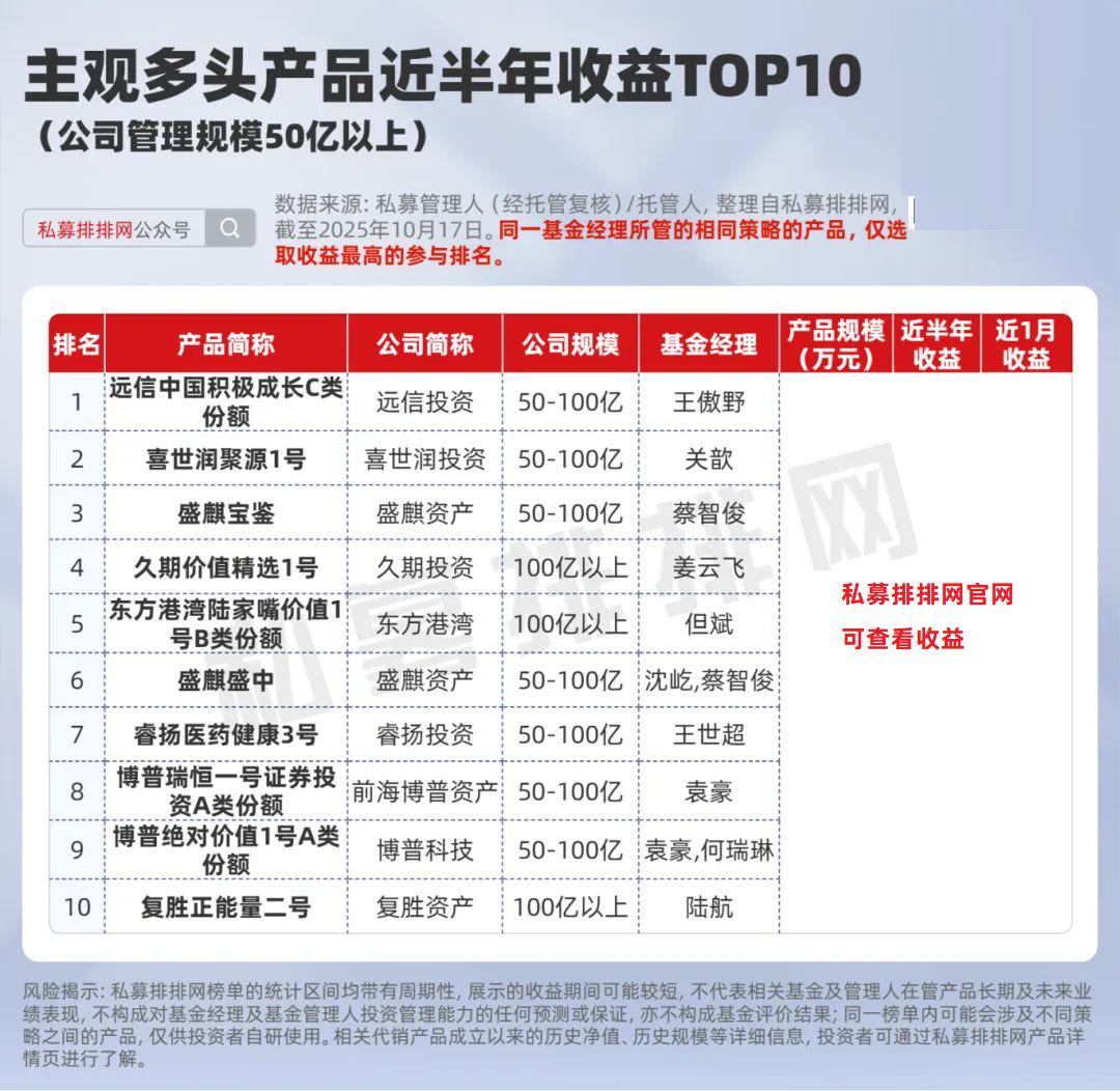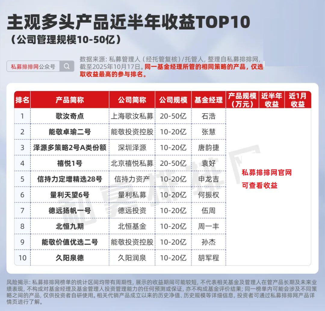 在头部私募(规模50亿以上)中,主观多头产品共有272只,平均收益为34.77%。其中近半年收益10强的产品上榜门槛为***%。