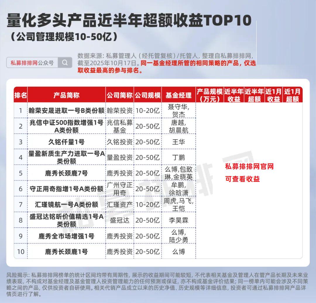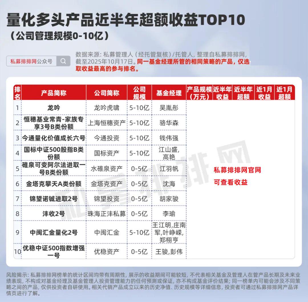 在以上10强量化多头产品中,近1个月跑出正超额的产品共有5只。其中,近半年超额收益(***%)最高的是“量魁中证1000指数增强一号A类份额”,由量魁私募梁涛管理。