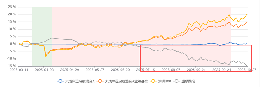 截至最新10月27日,该基金的收益仅为0.26%,跑输同期业绩比较基准近15个百分点,跑输沪深300指数近20个百分点,业绩在近半年成立的基金中排名垫底。并且,其超额亏损的差距随着时间的推移越拉越大。
