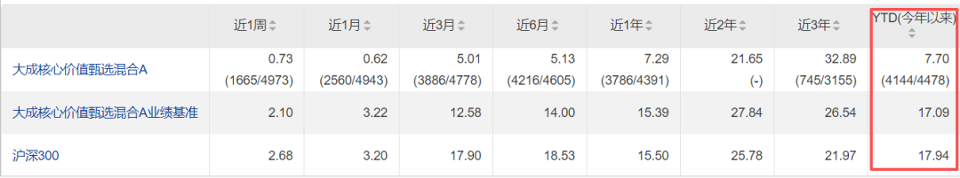 他管理的老产品“大成投资严选六月持有”,今年以来的收益是12.34%,跑输同期业绩比较基准1.6个百分点,排名3938/4478。