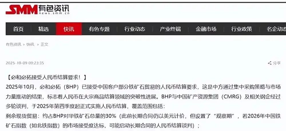 据SMM报道,澳大利亚矿业巨头必和必拓低调宣布,自今年第四季度起,港口现货铁矿石将以人民币到岸价结算。长期协议则设观察期至2026年,若届时人民币铁矿石指数市场接受度达标,将正式启动以人民币为基准的长期定价谈判。