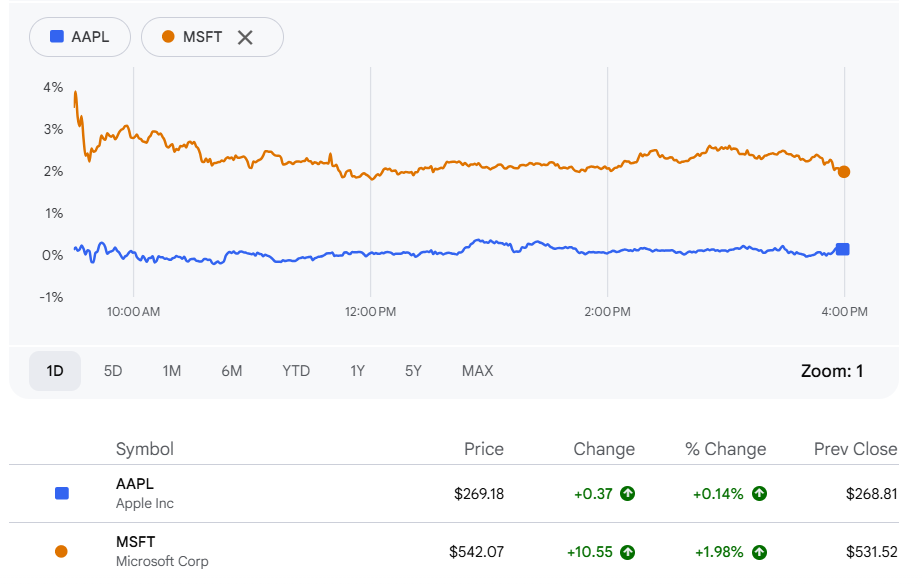 周二苹果股价微涨0.07%,公司市值曾在盘中突破4万亿美元。另一科技巨头微软的股价当日也上涨约2%,使其市值重回4万亿美元,并成功收于该关口之上。