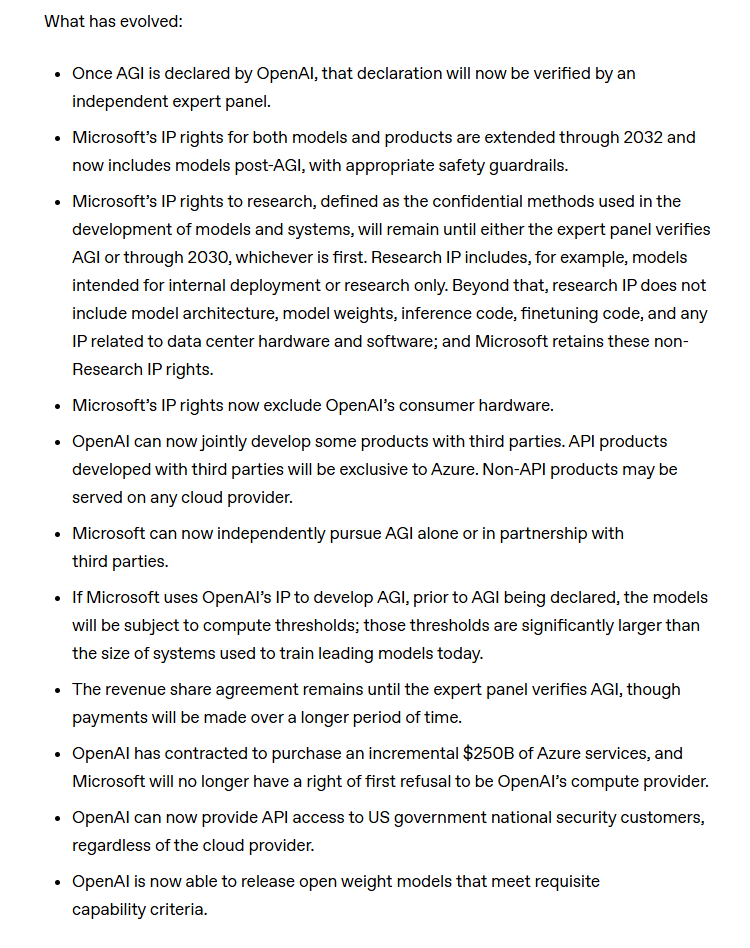 此外,OpenAI仍是微软的前沿模型合作伙伴。根据声明,微软对OpenAI模型和产品的知识产权授权延长至2032年,其中包含了AGI实现之后的模型(需配备适当的安全护栏)。