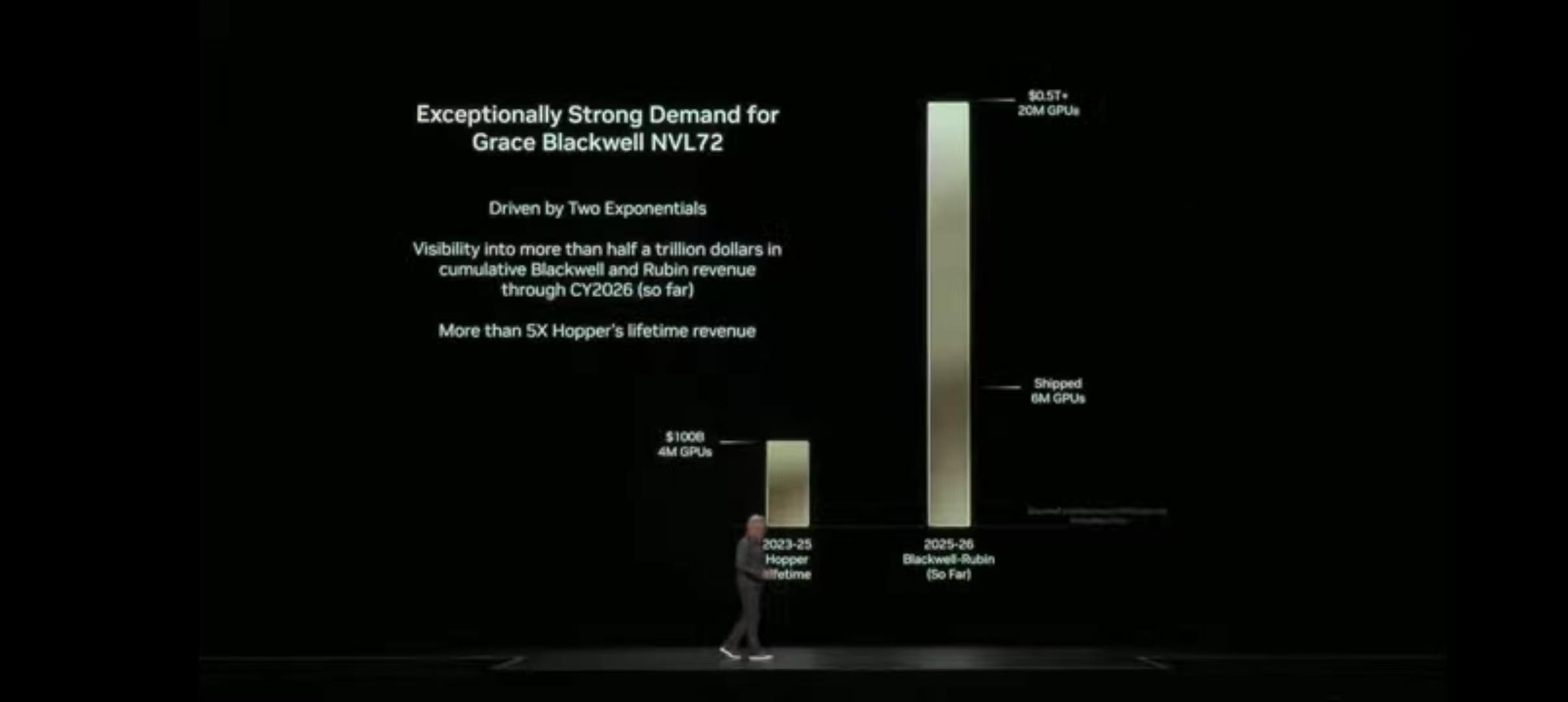 黄仁勋表示,英伟达Blackwell芯片正在美国亚利桑那州全面生产,英伟达还在为采用下一代架构Rubin的芯片生产做准备,Rubin进入生产的时间点可能是明年10月或更早的时候,“目前已经可以看到,今年及2026年(自然年),Blackwell和Rubin可带来的收入超过5000亿美元,这个收入将来自2000万颗GPU,目前已出货量600万颗。5000亿美元收入将是2023年~2025年Hopper架构芯片所带来收入的5倍。”