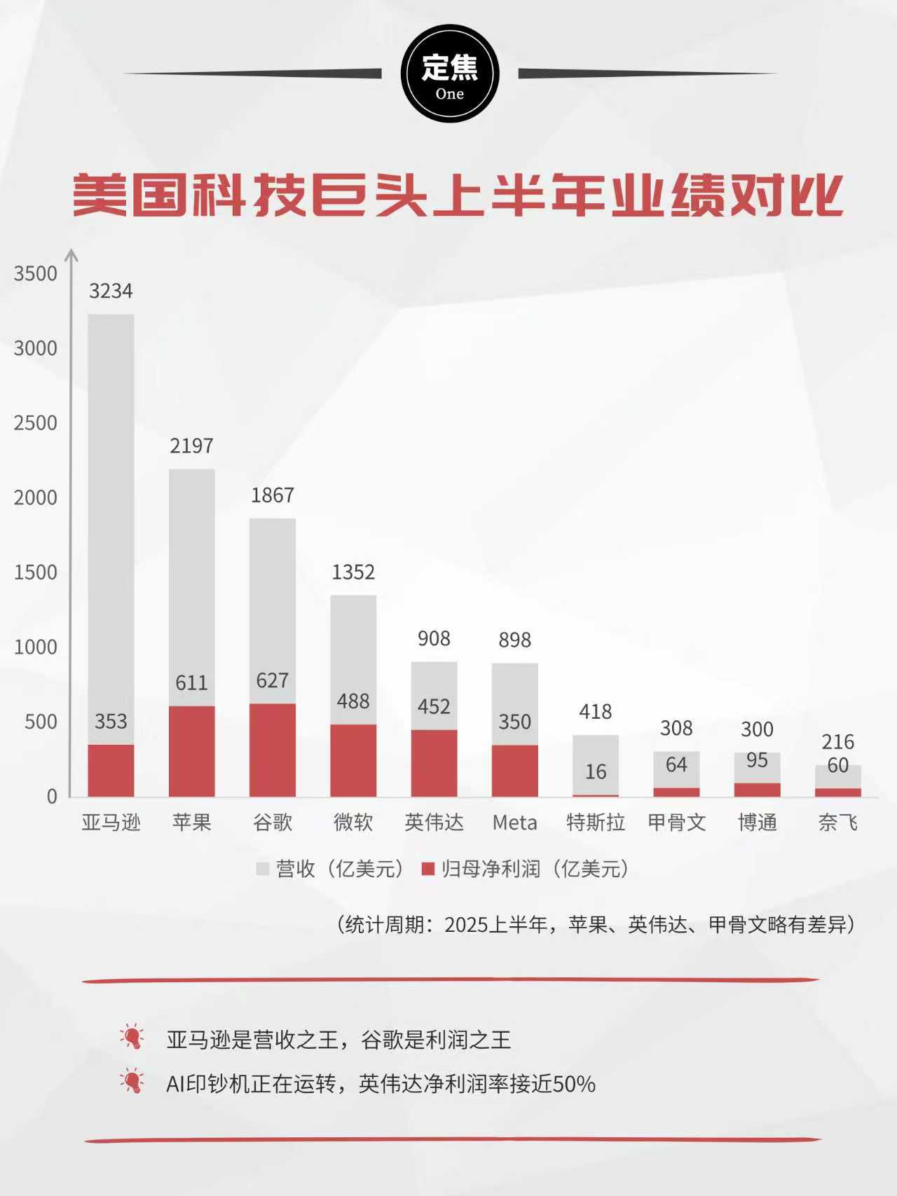 美股科技巨头中,英伟达、博通等芯片企业涨幅领跑,甲骨文、谷歌、Meta、微软则靠云服务和大模型布局维持股价走势。但特斯拉、苹果、亚马逊等消费科技股涨幅低迷,特斯拉上半年净利润仅16亿美元,折射出新能源赛道竞争之惨烈。