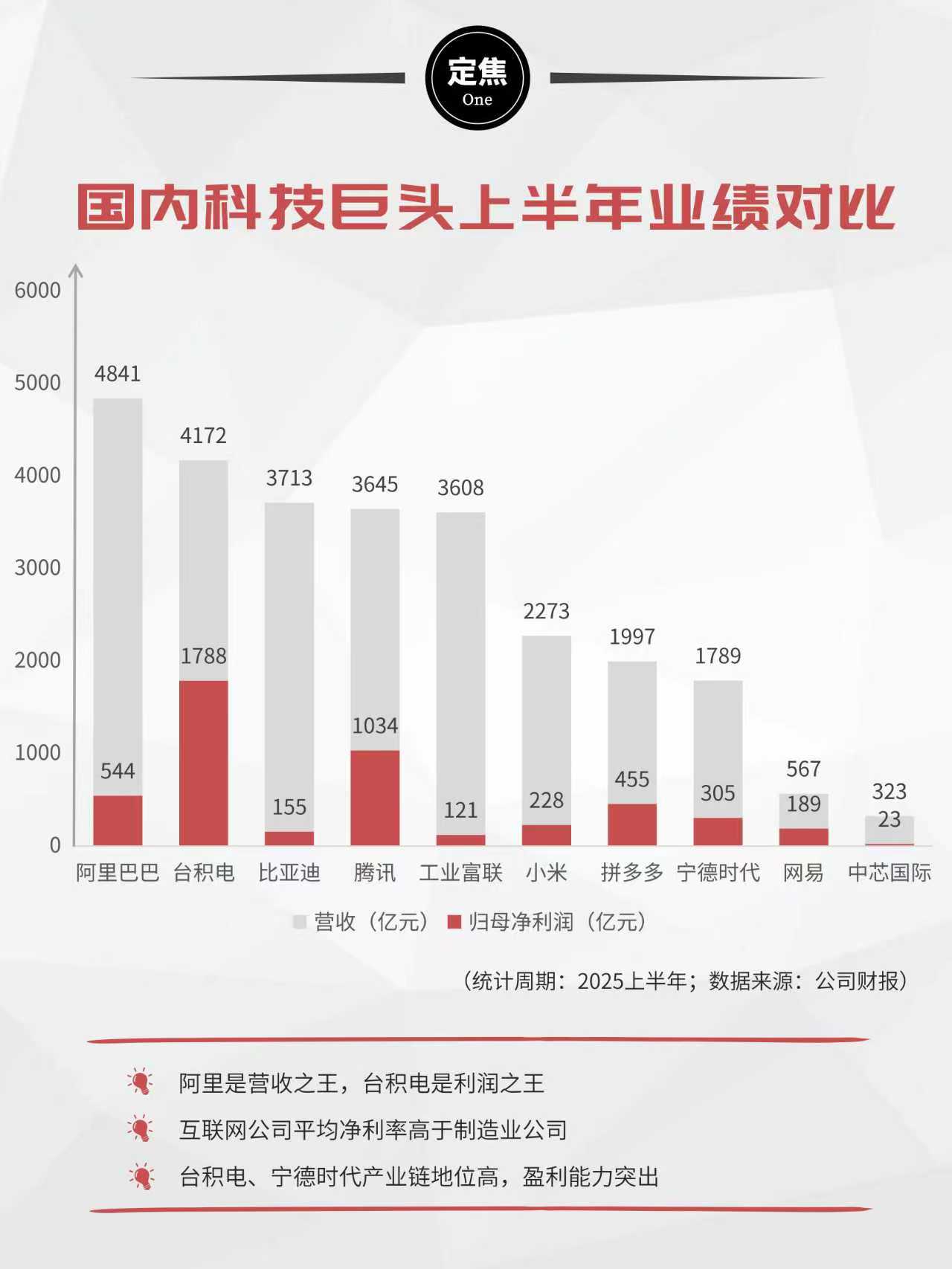 业绩维度,阿里凭半年4841亿元稳坐营收之王,台积电则以半年1788亿元利润称冠。总体来看,互联网公司平均净利率高于制造业公司,台积电、宁德时代除外,这两个巨头因为产业链地位高,盈利能力十分突出。