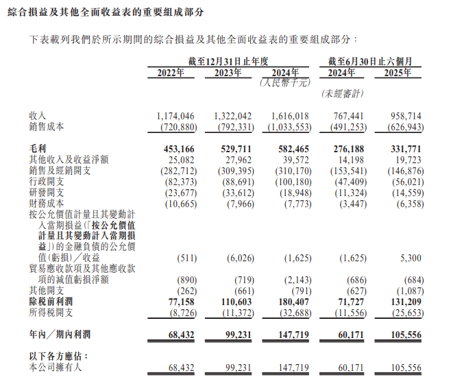 财务方面,2022年度、2023年度、2024年度、2024年上半年及2025年上半年,溜溜果园实现收入分别约为11.74亿元、13.22亿元、16.16亿元、7.67亿元、9.59亿元;同期,年内/期内利润为6843.2万元、9923.1万元、1.48亿元、6017.1万元、1.06亿元。