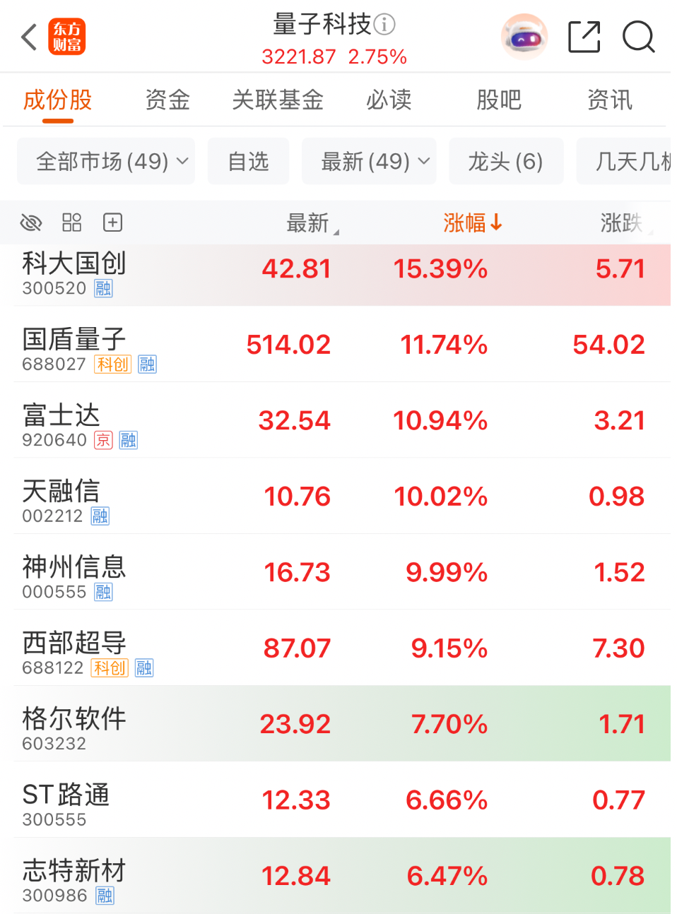 10月29日,A股开盘后,量子科技概念股全线爆发,神州信息、天融信直线涨停,科大国创、国盾量子、富士达大涨超10%,西部超导、志特新材、禾信仪器、吉大正元、格尔软件等个股跟涨。