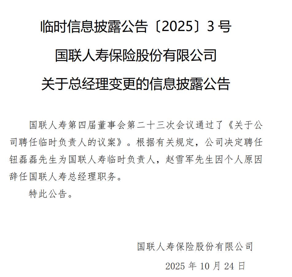 10月24日,国联人寿发布一则临时信息披露公告。公告显示,公司决定聘任钮磊磊为国联人寿临时负责人,赵雪军因个人原因辞任国联人寿总经理职务。
