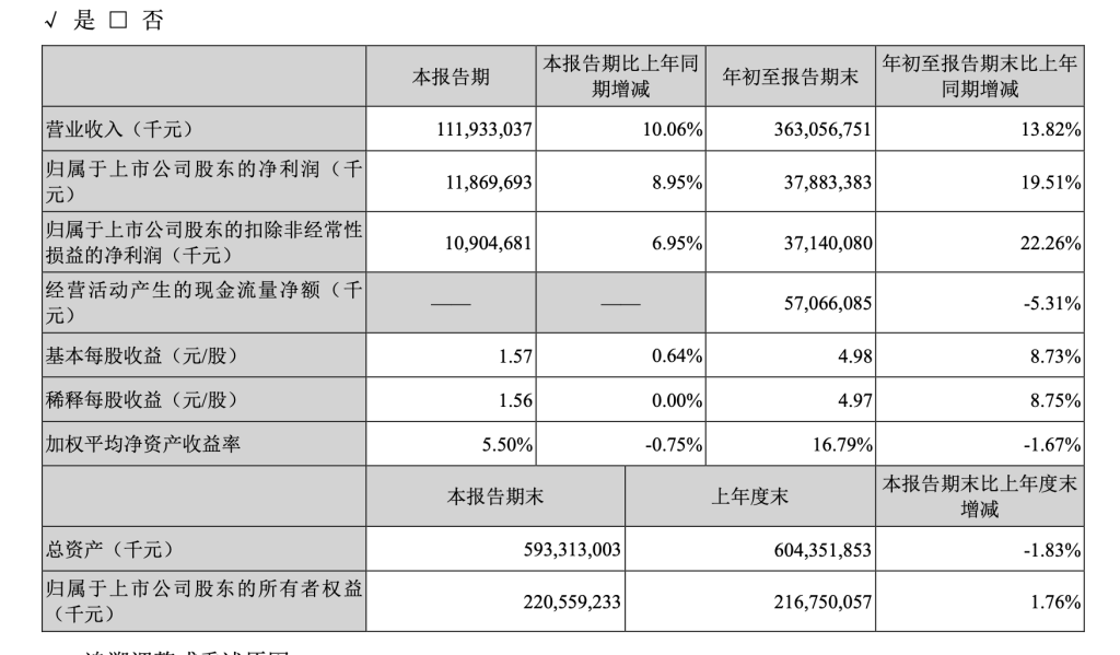 10月29日晚,美的集团(000333)发布第三季度业绩:期内,营收1119亿元,增长10.06%,净利润119亿元,增长8.95%。每股收益为1.57元。
