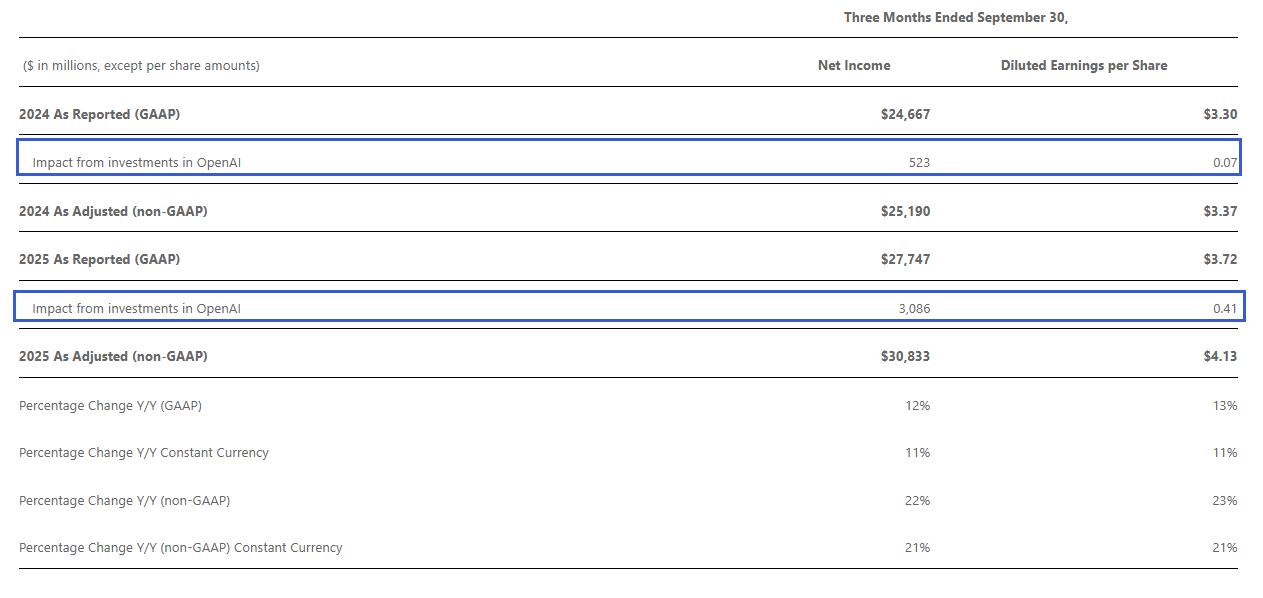 财报显示,GAAP口径下,三季度投资OpenAI对微软净利润带来的影响为30.86亿美元,远超一年前的5.23亿美元,对EPS盈利的影响为每股0.41美元,也远超一年前的每股0.07美元。