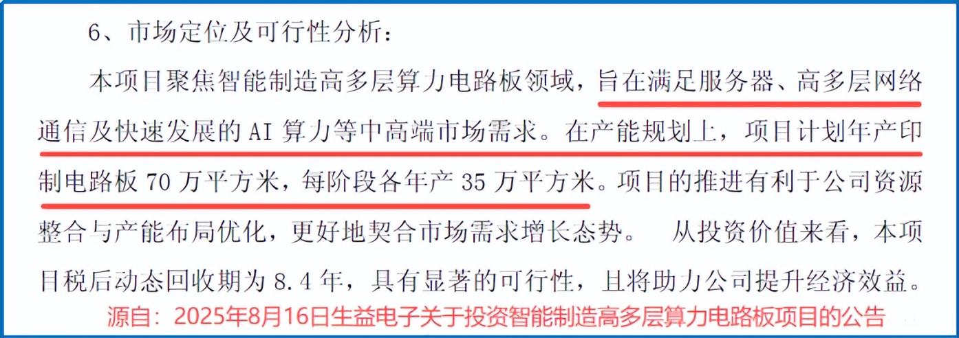 这个新项目聚焦智能制造高多层算力电路板领域,规划年产能70万㎡。其中,第一阶段35万㎡预计2026年试生产,第二阶段35万㎡预计2027年试生产。