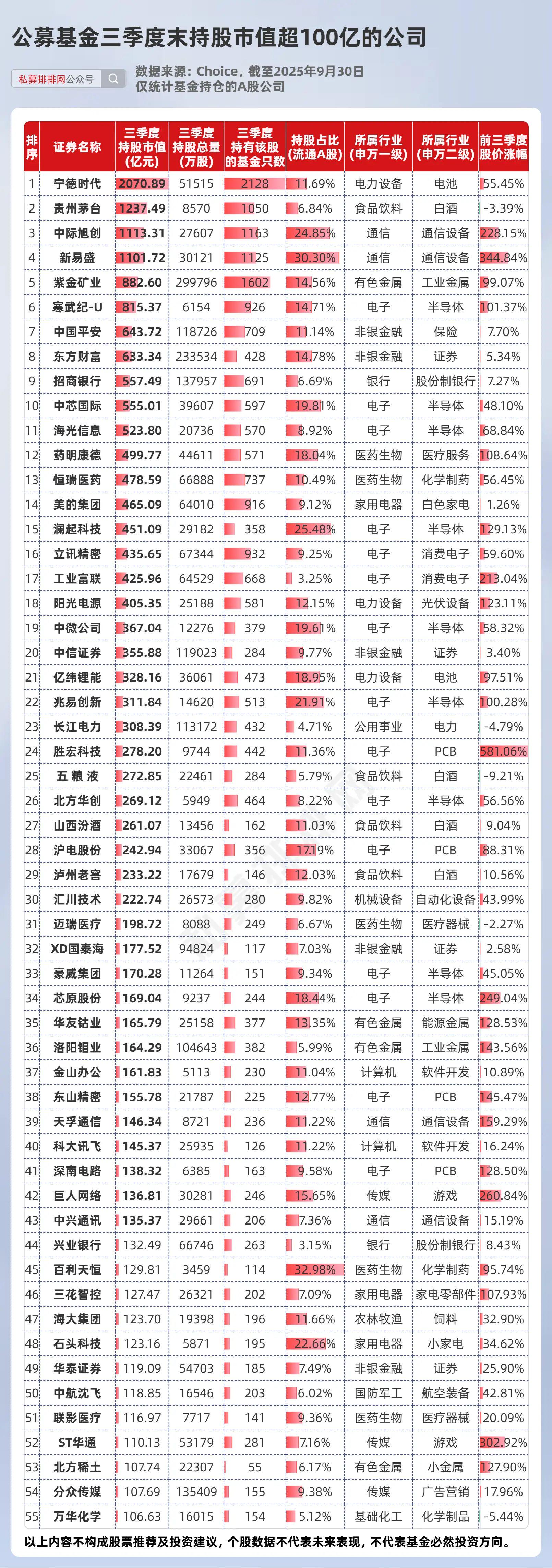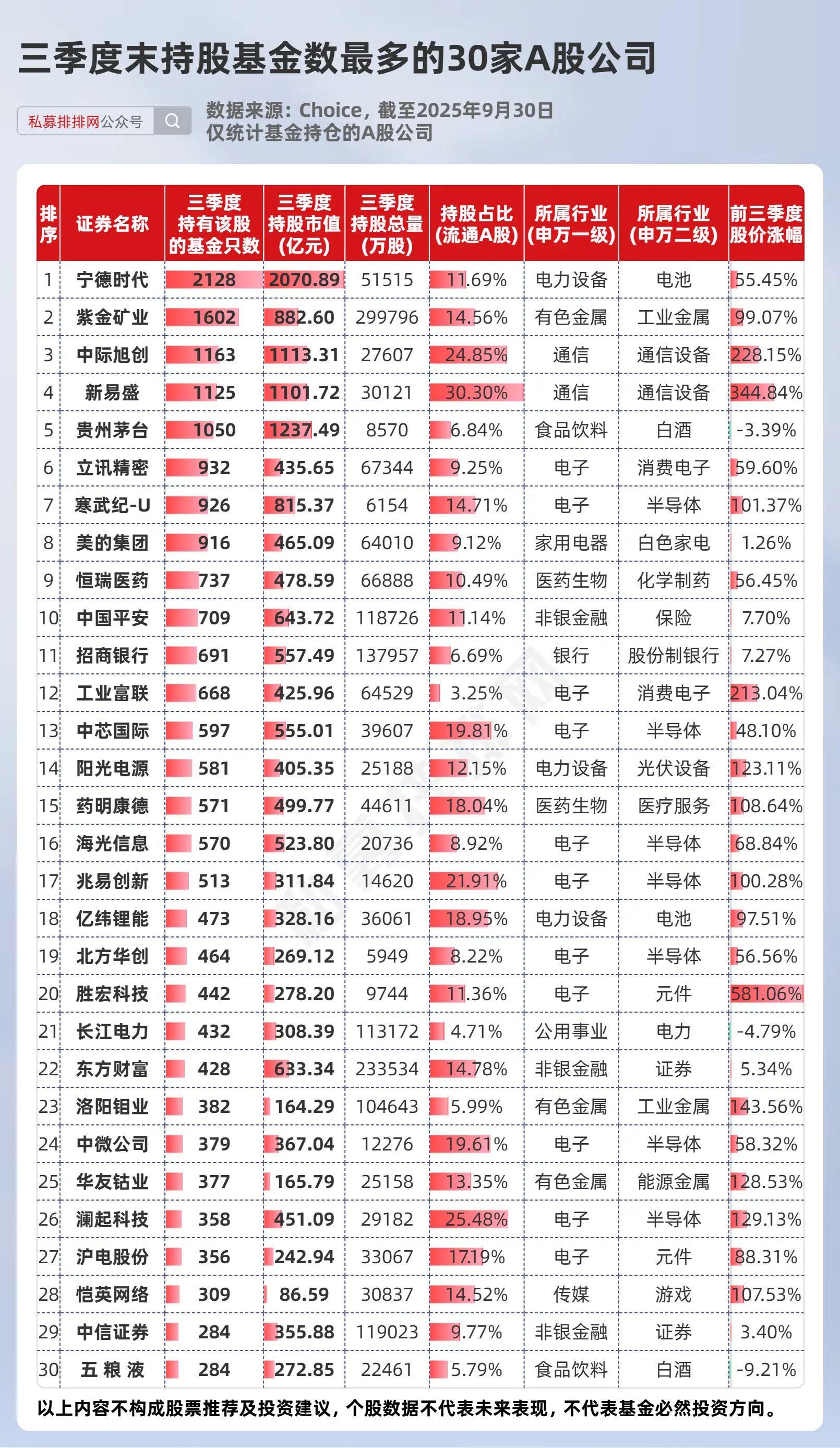 其中,电子行业公司占11家,有色金属、电力设备、非银金融行业各占3家。宁德时代、紫金矿业、中际旭创、新易盛、贵州茅台等5家公司在2025年三季度末均被上千只基金重仓持有。
