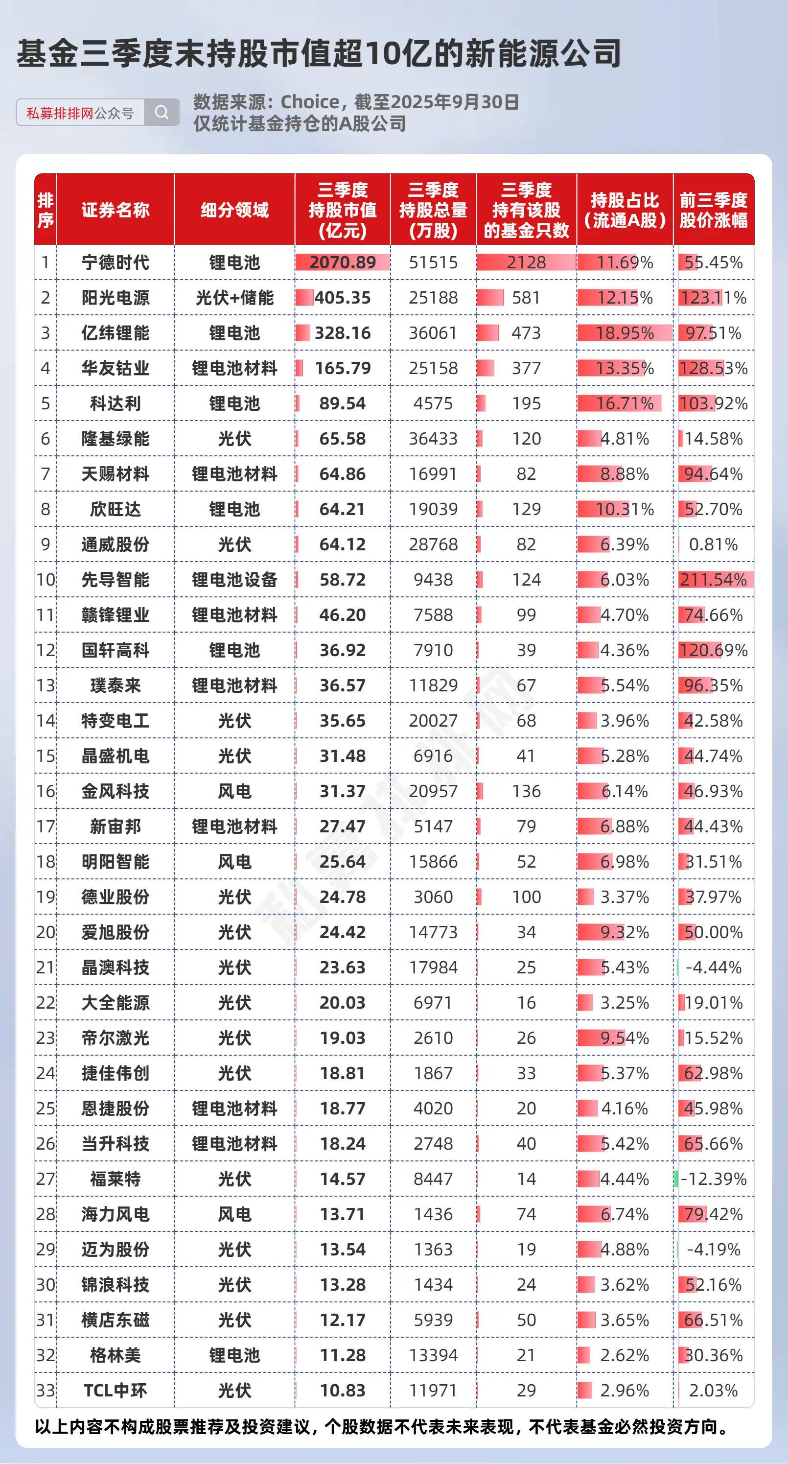 经笔者统计,2025年三季度末,有33只新能源概念股被基金持股均超10亿元。其中,锂电池龙头宁德时代被基金持股超2000亿元,阳光电源、亿纬锂能、华友钴业等个股也分别被基金持股达405亿元、328亿元、166亿元。