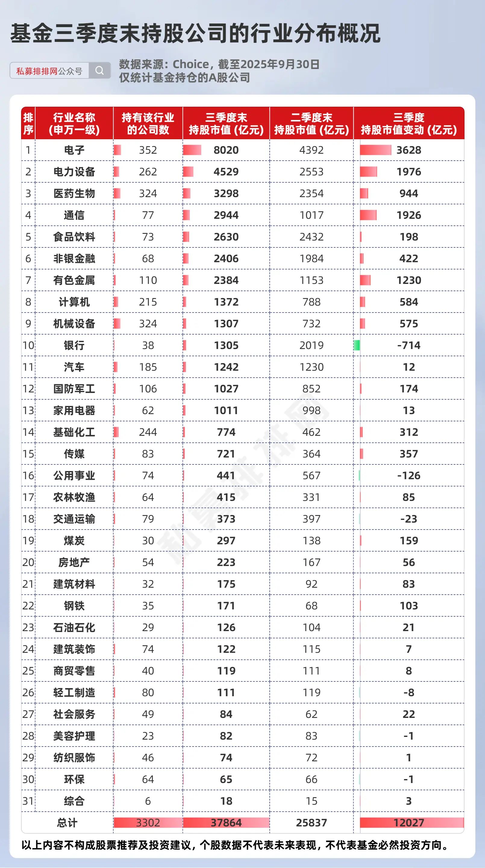 相比二季度,基金对电子行业的持股市值暴增超3600亿元,对电力设备、通信2个行业的持股市值也均增加了逾1900亿元,对有色金属行业的持股市值增加超1000亿元。对银行板块的持股市值减少最多,减少超700亿元。(持股市值变动受持股数和股价变动的双重影响)