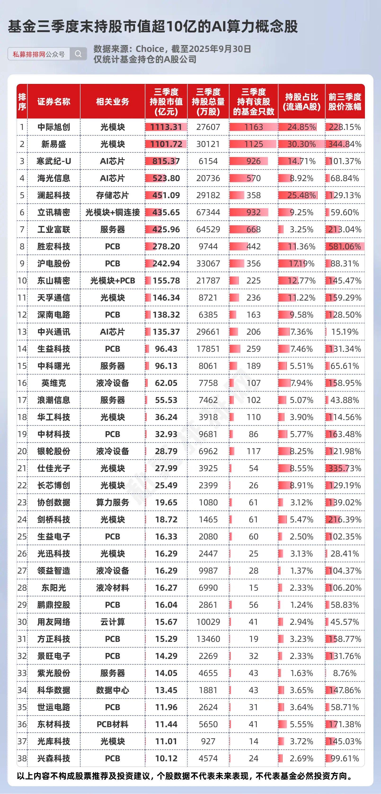 基金重仓38只AI算力股,中际旭创、新易盛均被持股超1100亿