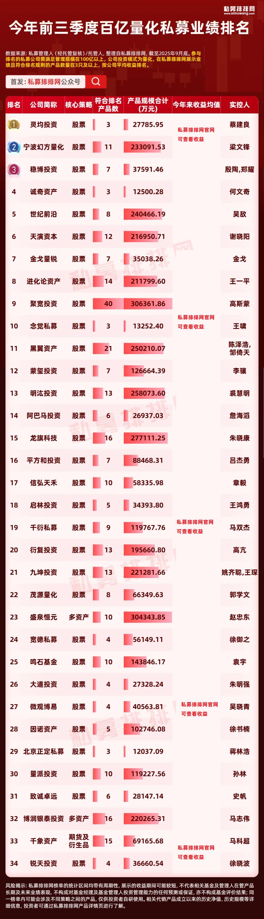 梁宏旗下2家头部私募海南希瓦(100亿以上)和上海希瓦(50-100亿元)均上榜,今年前三季度收益均值分别为***%和***%。