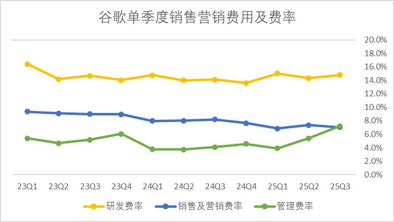 管理费用三季度有一笔诉讼一次性支出,扣除后也维持在4%左右,整体来看谷歌的费控水平还不错,也能从侧面印证三季度业绩表现驱动力不仅仅是市场投入。