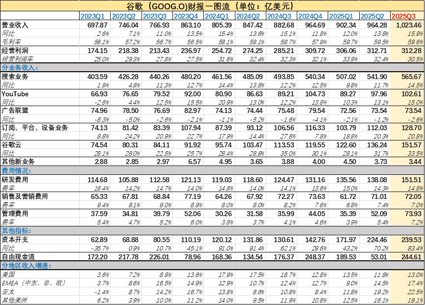 谷歌是目前为数不多既掌握桌面端流量入口(Chrome和Google),又掌握移动端流量入口(Android),还具备大模型能力(Gemini、Waymo等AI产品)和硬件(Pixel)的公司,因此谷歌的财报在一定程度上能够反应现阶段AI发展的全景。