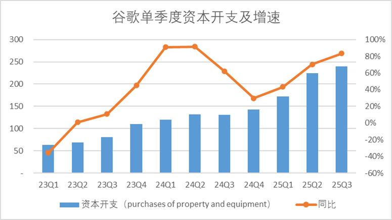 同时,三季度谷歌的资本开支录得240亿美元,高基数下同比再增83%,超过了市场预期,今年以来整体的资本开支规模达到了636亿。