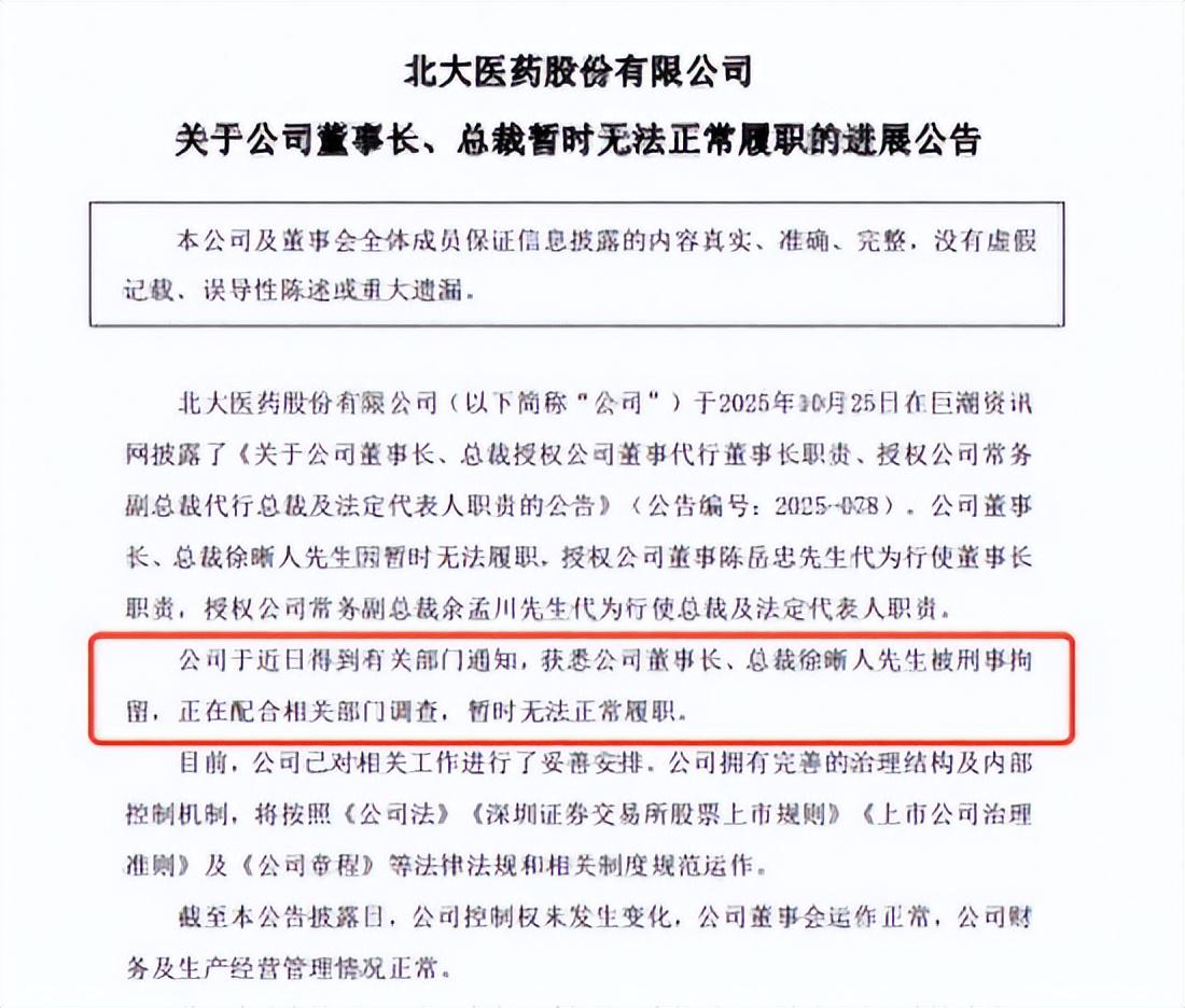 2025年10月30日,北大医药(000788.SZ)陡然发布公告,董事长兼总裁徐晰人因配合调查而被刑事拘留,此时距离他全面接管公司仅仅过去了半年时间。