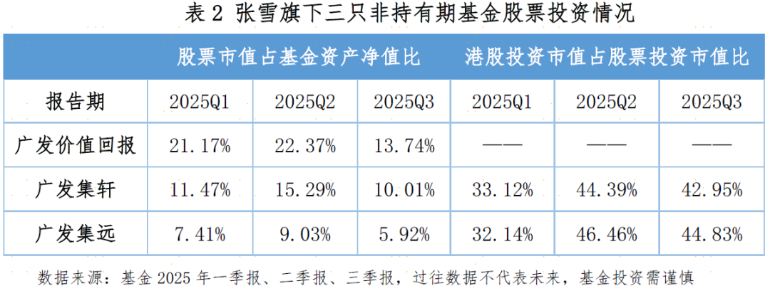 广发集远和广发集轩都是权益占比低于20%的二级债基,可投港股,而广发价值回报是一只仅可投A股,股票仓位在0-40%之间的偏债混合型基金。从基金的定期报告来看,2025年一季度到三季度,每个季度末,基金的股票市值占净值比都呈现明显的阶梯特征,不同定位的产品之间有5%-10%左右的差别,但加减仓的方向和权益的配置上呈现一致性。