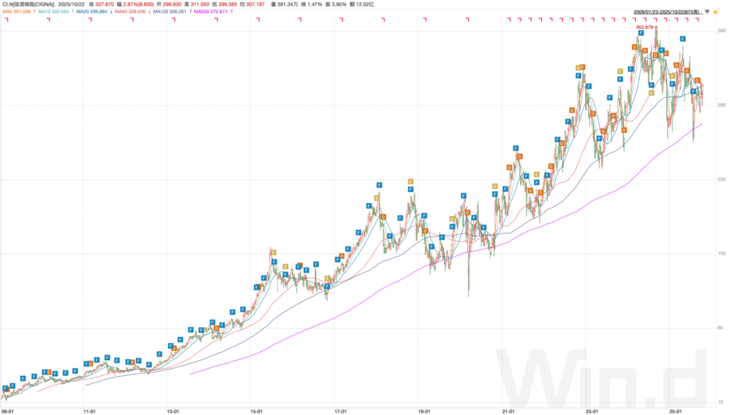 图:Cigna长期股价走势;资料来源:wind,36氪