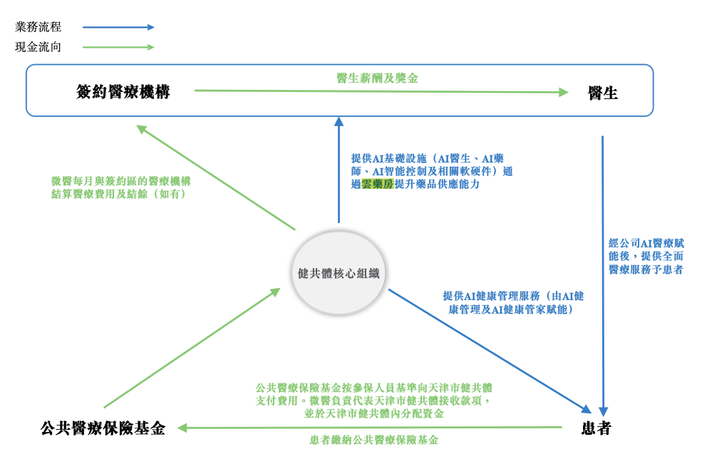 图:微医全病种健康管理服务业务流程与现金流向;资料来源:微医招股书,36氪