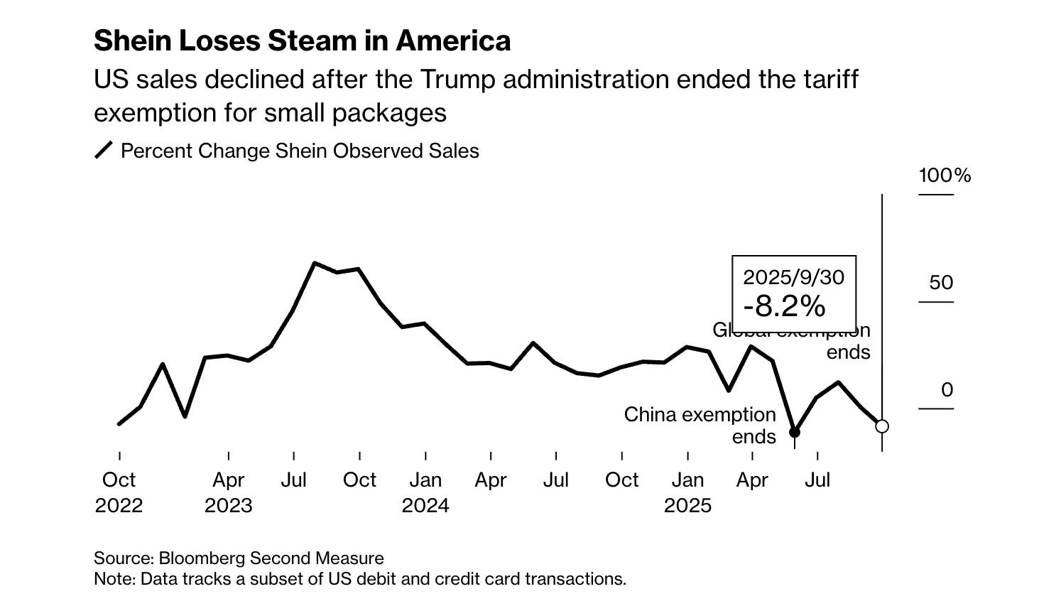 彭博社旗下调研机构Bloomberg Second Measure(BSM)数据显示,SHEIN 2025年9月销售额较2024年同期下降了8.2%。这是BSM对一组匿名美国消费者交易情况跟踪后得出的结论。而据BSM数据,这是过去3年来SHEIN销售额第二差的月度业绩——最差表现来自2025年5月,彼时同比降幅10.9%,同为关税调整期间。