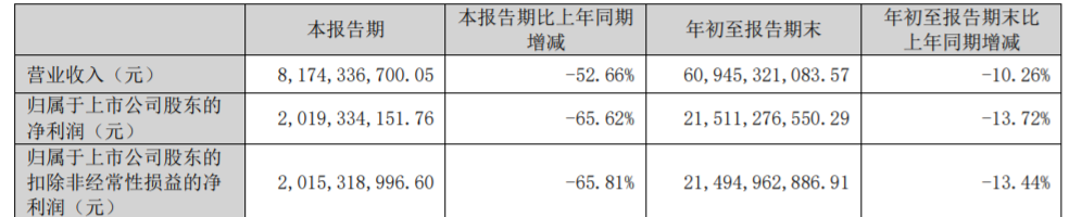 净利润20.19亿,同比下跌65.62%,直接砍了六成半!