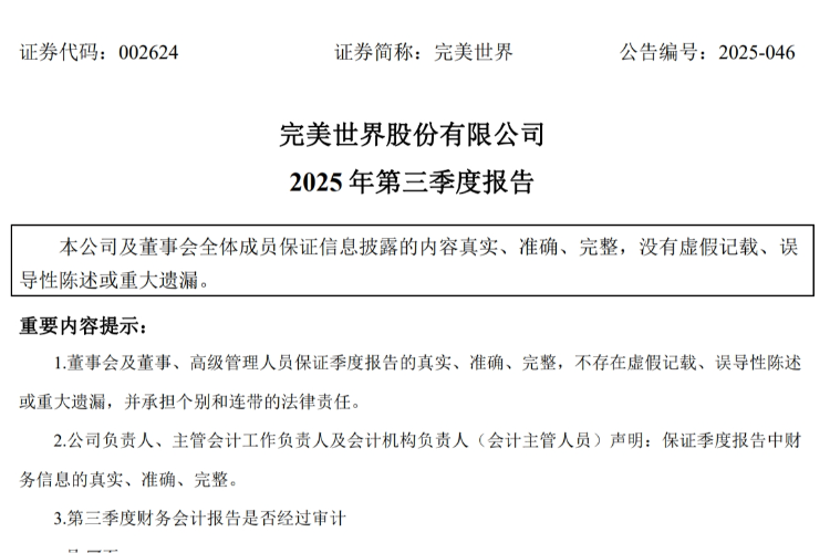 10月30日,完美世界发布2025年第三季度报告,今年第三季度实现营业收入17.26亿元,同比增长31.45%,实现归母净利润1.62亿元,同比增长176.59%。今年前三季度,实现营业收入54.17亿元,同比增长33.00%,实现归母净利润6.66亿元,较上年同期扭亏为盈。