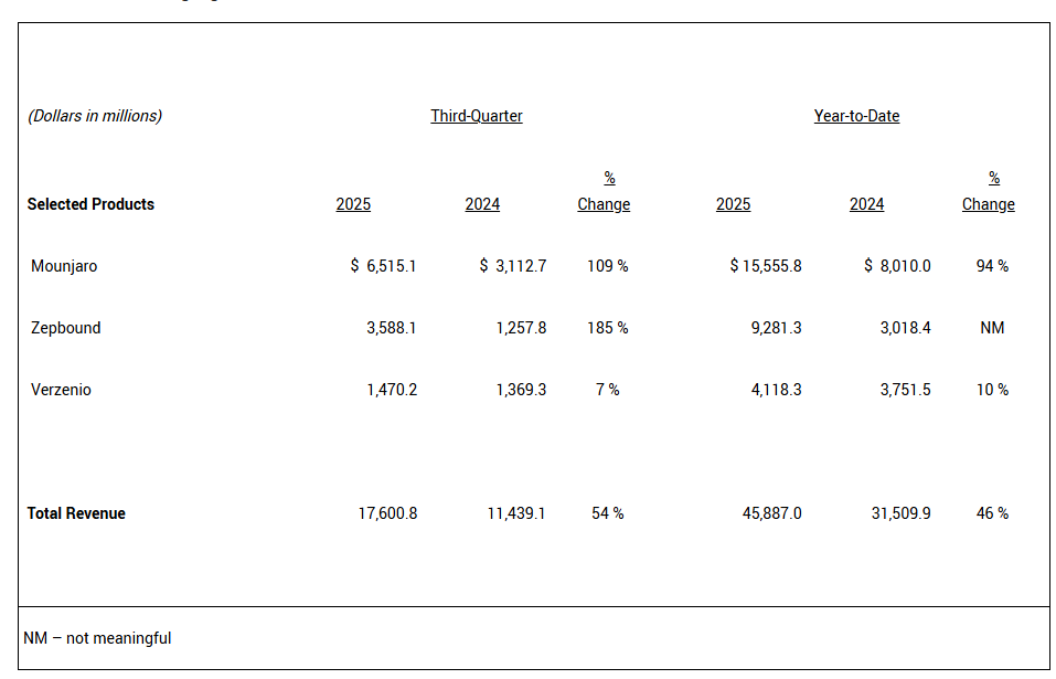 与第二季度一样,礼来公司董事长兼首席执行官David A. Ricks再次评价称:“礼来公司又实现了一个季度的强劲业绩。”这份业绩的最大贡献者仍然是GLP-1/GIP药物替尔泊肽销量的增长。