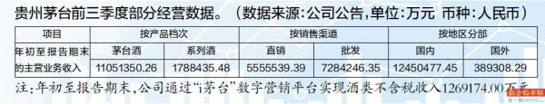 而从渠道业绩收入来看,今年前三季度,贵州茅台的直销(直营)渠道收入为555.55亿元,占总营收约43.2%,批发(经销商)渠道约728.42亿元,占总营收约56.8%。另外贵州茅台海外业务方面,今年前三季度收入录得38.93亿元,比去年34.82亿元增加11.8%。