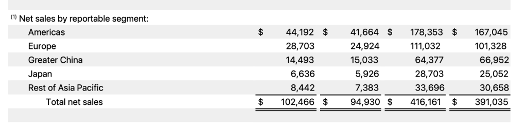 包括Apple Watch、AirPods 和 Vision Pro在内的其他产品类别在第四财季略有下降,销售额为90.4亿美元。苹果公司Mac业务表现强劲,销售额增长13%,达到87.2亿美元。